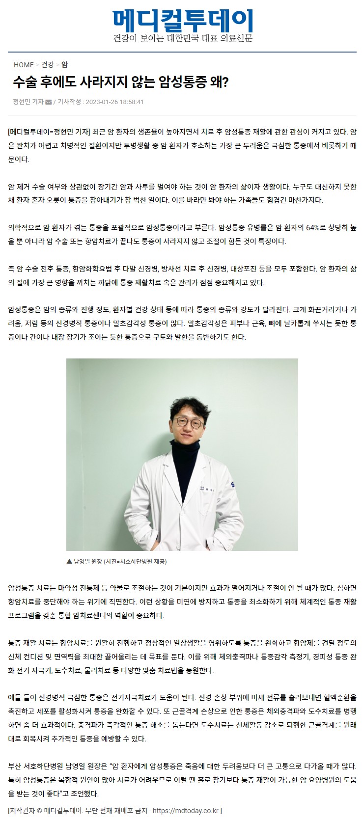 수술 후에도 사라지지 않는 암성통증 왜? 페이지 정보 작성자 최고관리자 댓글 0건 조회 10,773회 작성일 23-01-27 14:08 목록 본문 https://mdtoday.co.kr/news/view/1065606744622701 관련링크 https://mdtoday.co.kr/news/view/1065606744622701 9371회 연결 이전글유방암 수술 후 관리 어떻게?! 23.02.17 다음글고압산소치료, 항암 치료 효과 높이는 이유 23.01.27 댓글 0 댓글목록 등록된 댓글이 없습니다.