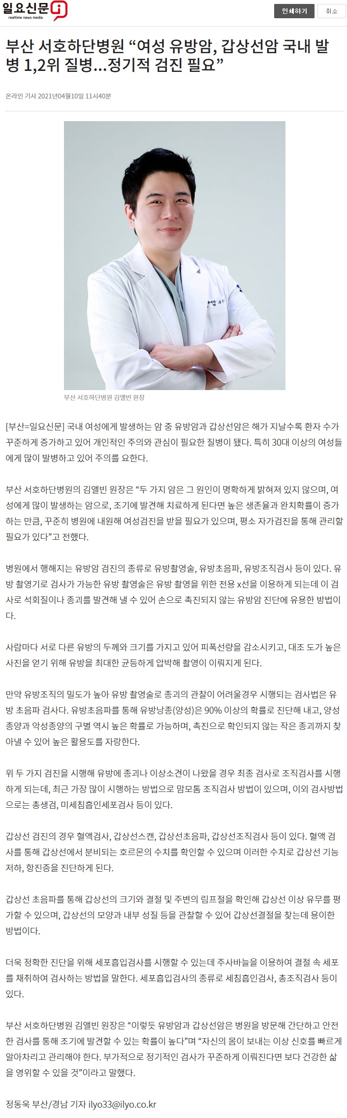 “여성 유방암, 갑상선암 국내 발병 1,2위 질병...정기적 검진 필요”