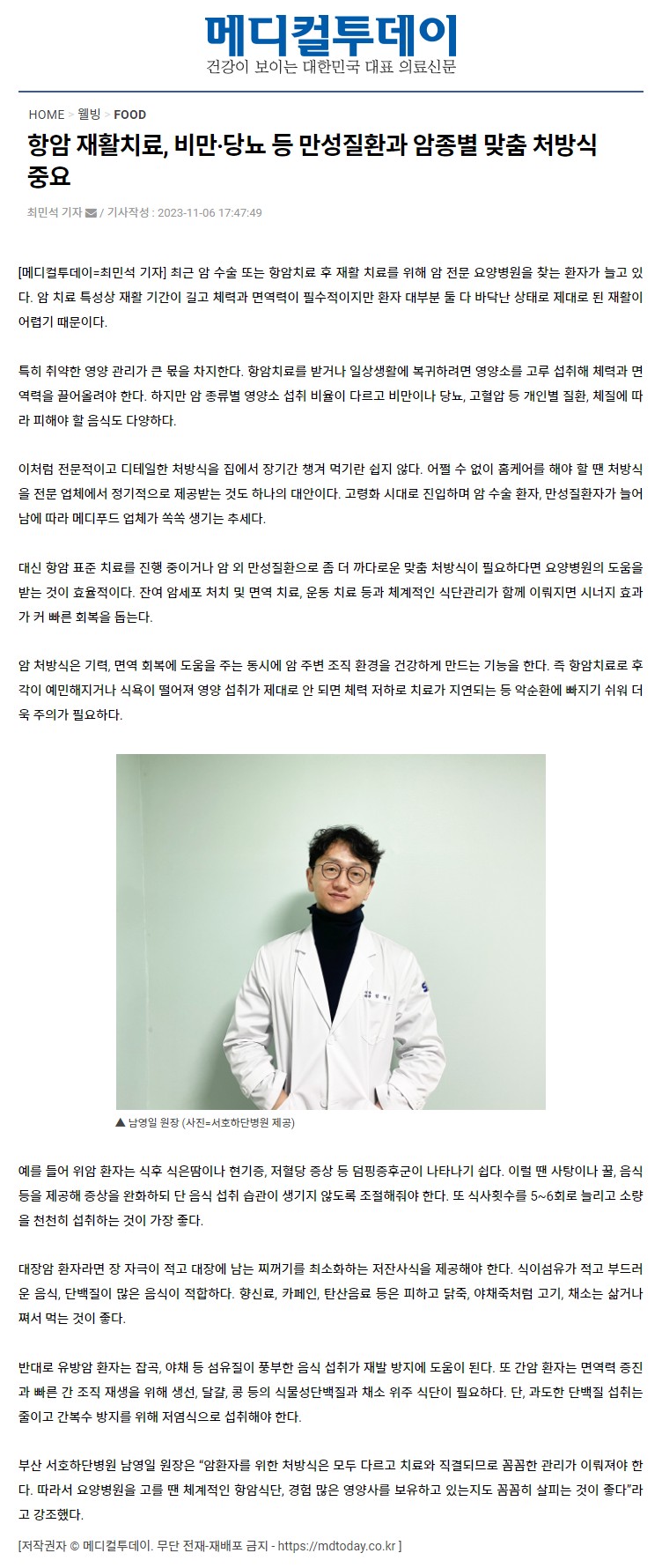 항암 재활치료, 비만‧당뇨 등 만성질환과 암종별 맞춤 처방식 중요